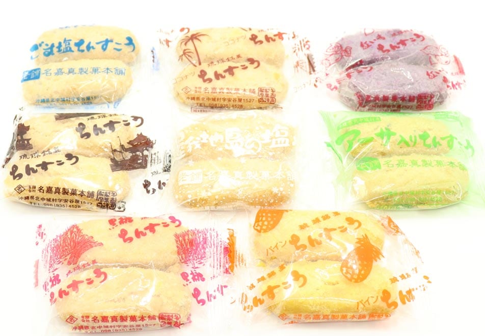 8種類:プレーン、黒糖、塩、紅芋、ココナッツ、パイン、ごま塩 珍しいアーサ(あおさ)味